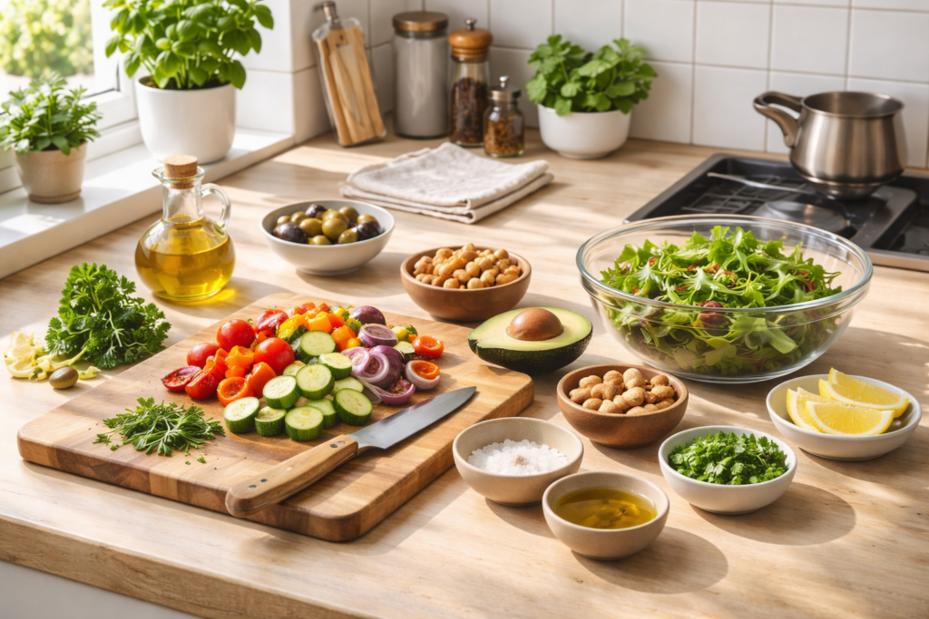 A alimentação mediterrânea está associada a hábitos que favorecem o equilíbrio do organismo. Ao priorizar fibras, gorduras boas e proteínas de qualidade, esse padrão alimentar pode contribuir para maior saciedade ao longo do dia.